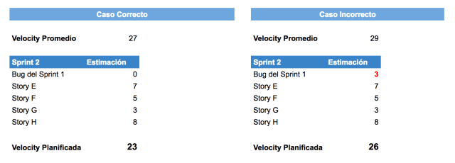 Veamos como queda en el ejemplo, la planificación del segundo Sprint. Notemos que la Velocity en el caso incorrecto es mayor, pero no es realista. ¿Podría contar el Product Owner con esa velocity para planificar nuevas funcionalidades en el Sprint 3?