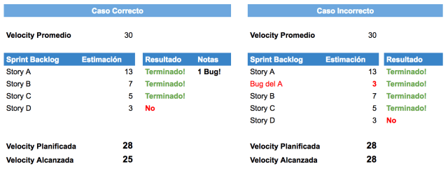 Una funcionalidad «Completada» significa que no tiene Bugs pendientes. Si el desarrollo produce Bugs y los estos tienen una estimación aparte, se genera una métrica de Velocity engañosa que los esconde y no permite planificar.
