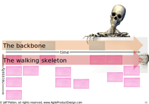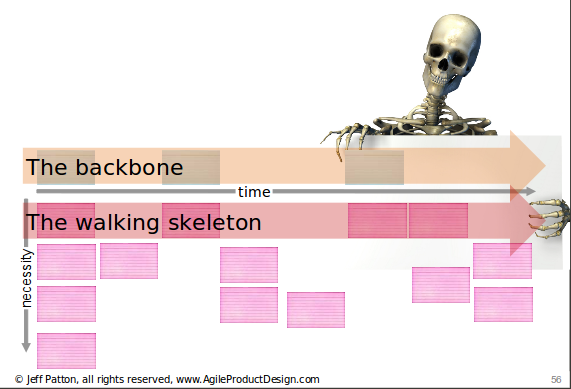 Con las activities y la primera fila de User Stories obtenemos lo que Jeff Patton denomina «The Walking Skeleton» (el esqueleto que camina) porque está completo y funciona, aunque sea en su forma más elemental.