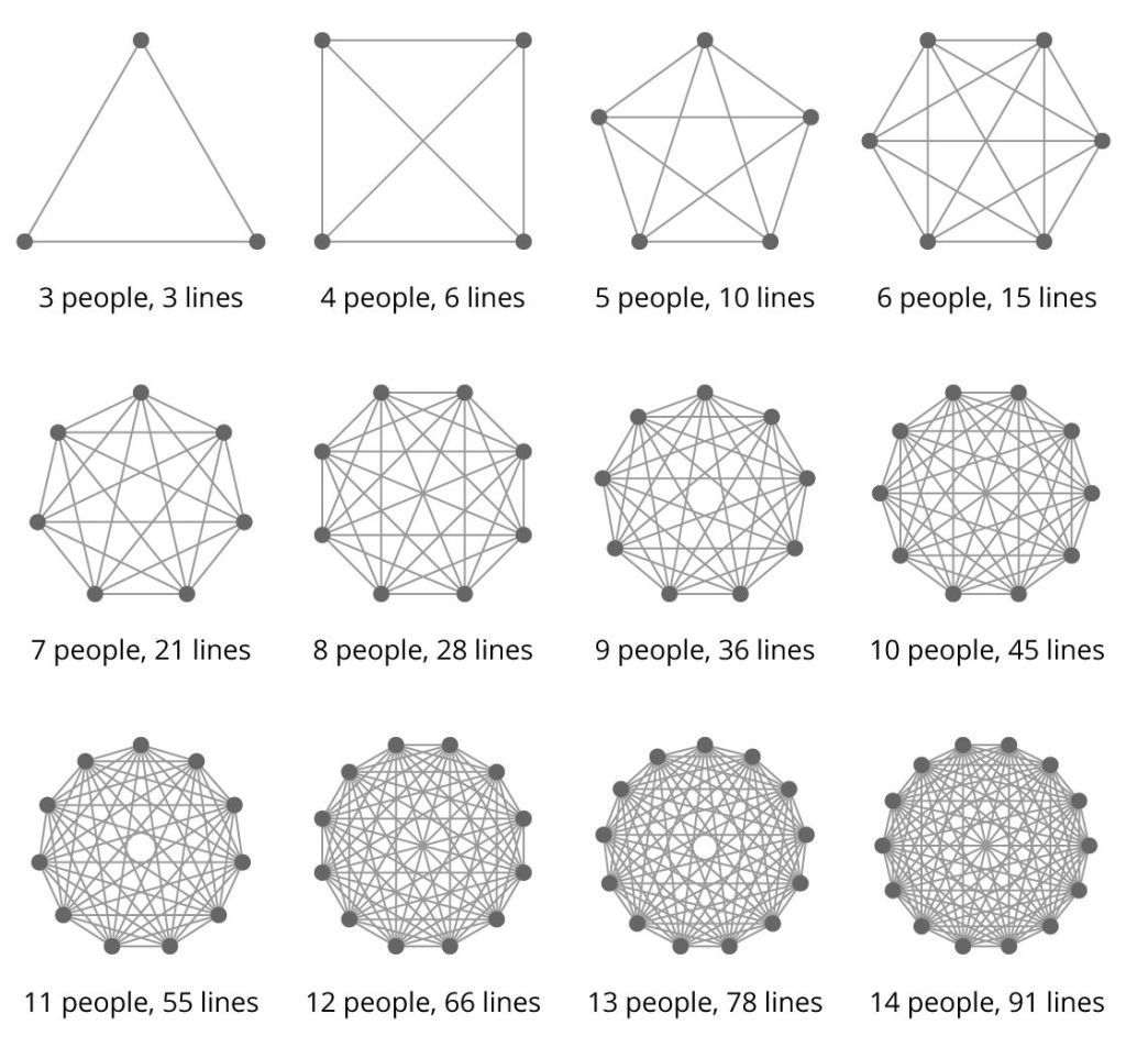 Otro impacto adicional, es que un equipo más grande conlleva más complejidad. Las líneas de comunicación entre personas aumentan exponencialmente siguiendo la fórmula N(N-1)/2, donde N representa el número de personas. Por ejemplo en un equipo de 10 personas hay 10(10-1)/2 = 45 canales de comunicación, mientras que con 14 personas hay 91 canales de comunicación entre los integrantes del equipo. El tamaño del equipo influye notablemente en la duración de las reuniones y en la cohesión del equipo.
