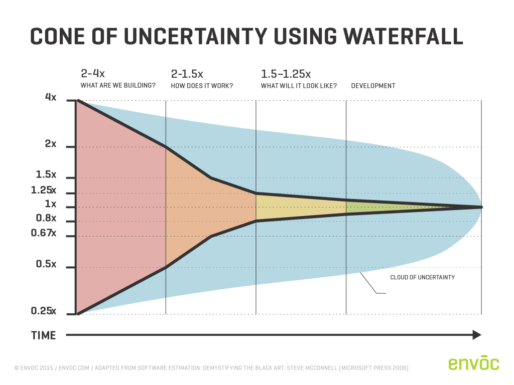 El Cono de la Incertidumbre4 es un modelo que describe que al inicio de un proyecto de software, el error de estimación oscila en un factor de entre 0.25x y 4x. La brecha se va reduciendo a medida que se avanza en el proyecto y solo se cierra cuando el proyecto se termina. Es decir, que los proyectos donde hay incertidumbre y variabilidad, intentar predecir desde el comienzo el alcance total y la fecha de entrega es una estimación que tiene demasiado margen de error para ser de utilidad o para coordinar compromisos con otros equipos.