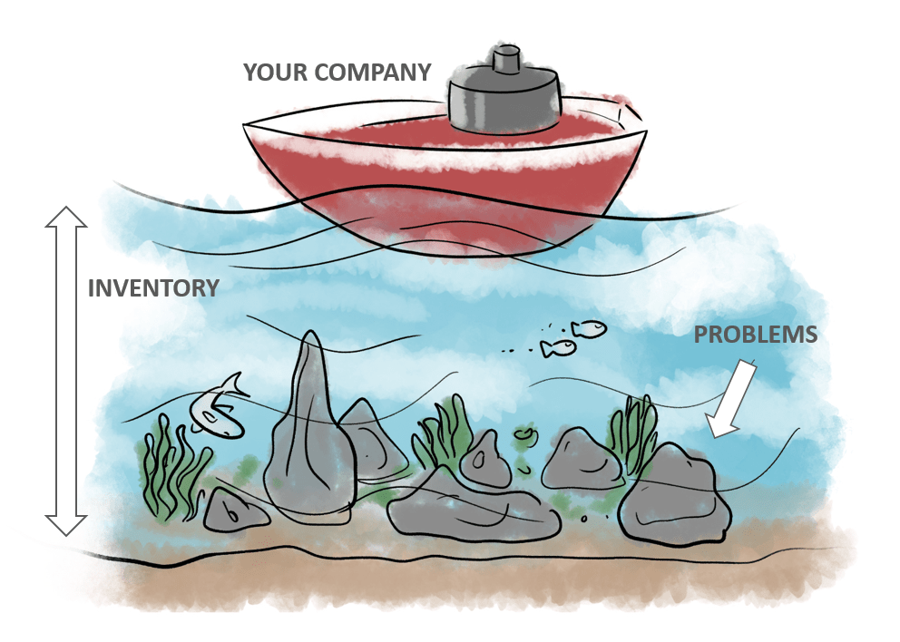 En Lean este concepto se ilustra con una metáfora, en la que el agua (la cantidad de trabajo) tapa los problemas.