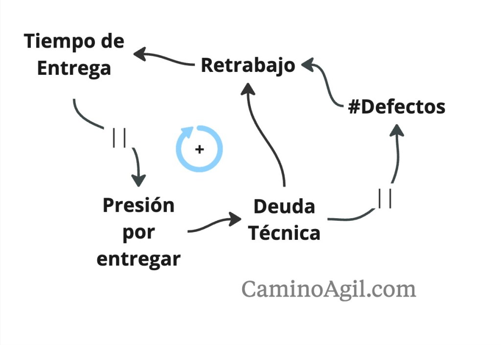 El problema mayor ocurre cuando la pagar la deuda técnica se posterga indefinidamente. Así es como la presión por entregar influye negativamente en la calidad de los productos, lo que a su vez genera consecuencias que impactan en los tiempos de entrega. Por ejemplo, no se automatizan las pruebas, no se revisa ni mejora el código, los controles de calidad se hacen a las apuradas con pruebas superficiales. Eventualmente se produce defectos y el tiempo es usado en la gestión de los mismos, la gestión de reclamos, retrabajo para solucionar los problemas, mantenimientos y mayor esfuerzo para hacer cambios sobre un producto mal construido. La “deuda técnica” son grandes causantes de demoras. Como se puede ver en el siguiente gráfico, aquí también se genera otro ciclo vicioso. Tanto por el retrabajo de pagar la deuda técnica como el retrabajo por los defectos.