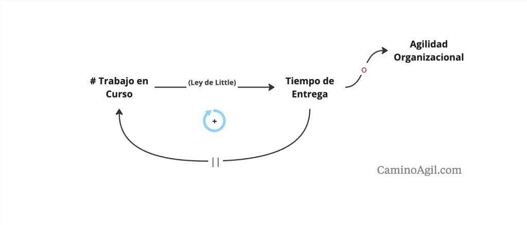 El siguiente diagrama ilustra esta situación, donde se puede apreciar que se genera un ciclo vicioso: a mayor tiempo de entrega – si no se toman medidas explícitas- eventualmente habrá más proyectos en curso. Lo cual a su vez genera más demoras. Este efecto de «bola de nieve» en el modelo sistémico se conoce como «bucle reforzador«.