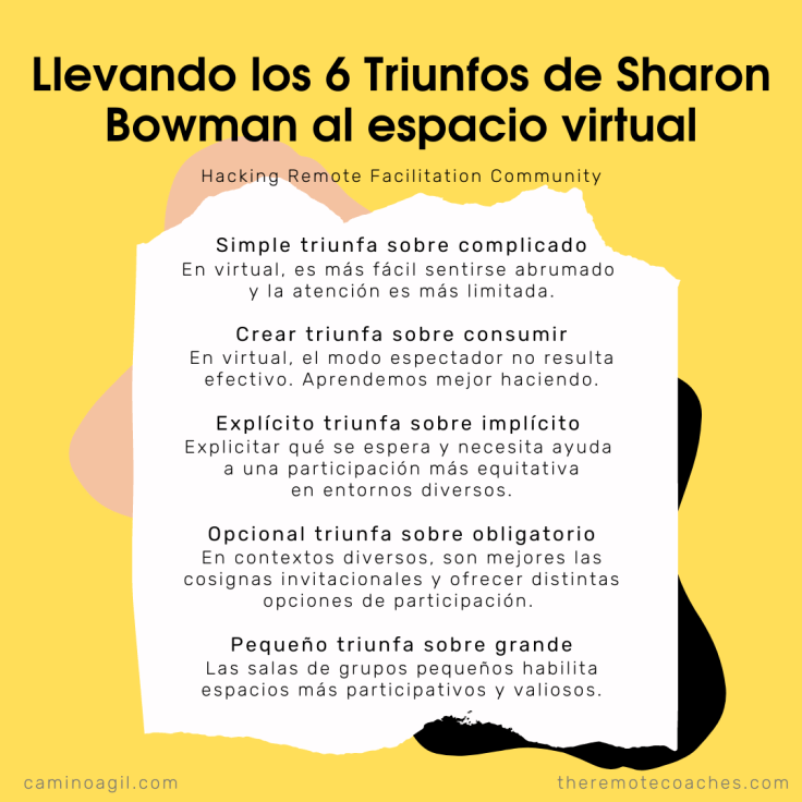 Recientemente, miembros de la comunidad de “Hacking Remote Facilitation” –Kirsten Clacey, Cindy Carless, Colleen Esposito, Adrian Tonkin, Paul Tevis, George Dinwiddie, Konrad Pogorzala, Socotra Williams, Cara Turner, Joanne Perold y Damián Buonamico– exploramos cómo los 6 triunfos de “Training From the Back of the Room” se pueden traducir a un contexto de trabajo remoto y te compartimos los resultados a continuación.