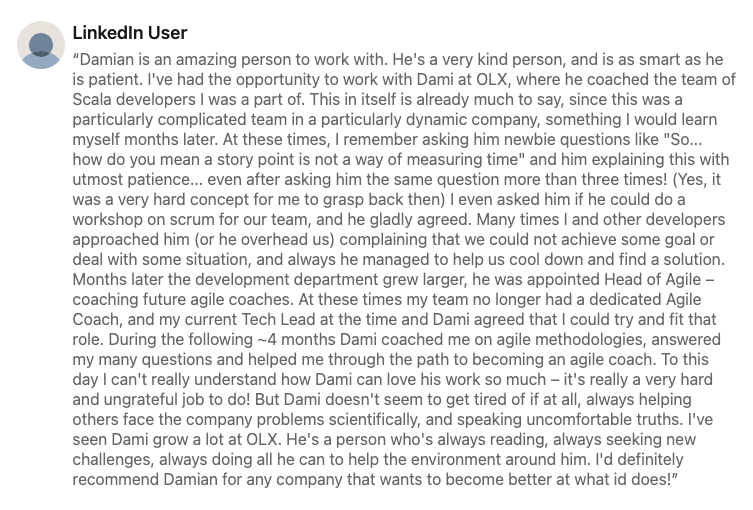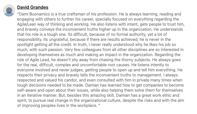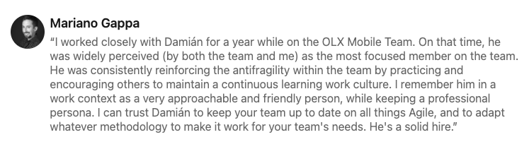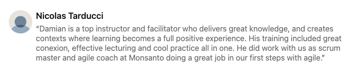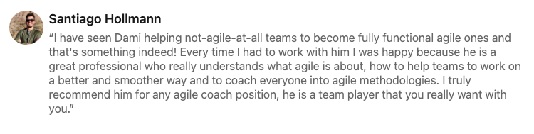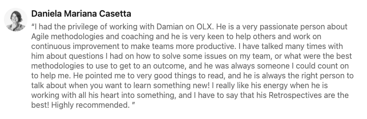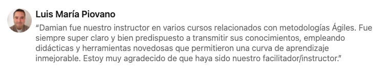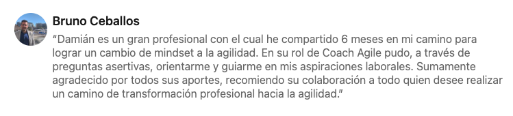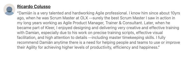 Mi nombre es Damián Buonamico, y soy un Consultor y Agile Coach freelance con 12 años de experiencia facilitando enfoques ágiles en más de 20 empresas, tanto en América Latina como en Estados Unidos e India.