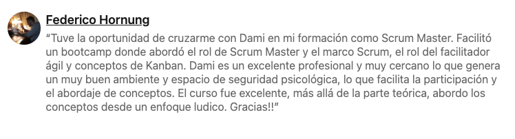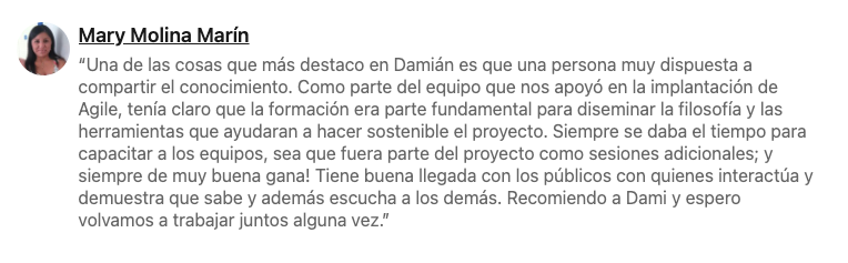 Ocasionalmente, participo como orador en charlas sobre agilidad en eventos y empresas, compartiendo mi experiencia y conocimientos con la comunidad ágil.